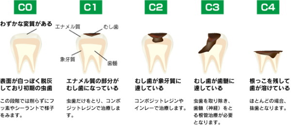 虫歯の進行度合いはCの後に数字をつけて表します。C0から始まり、C4はほとんどはが残っていない状態です。痛みもかなりあるはずです。歯が痛くなってから治療を始めても、できることは限られてきます。